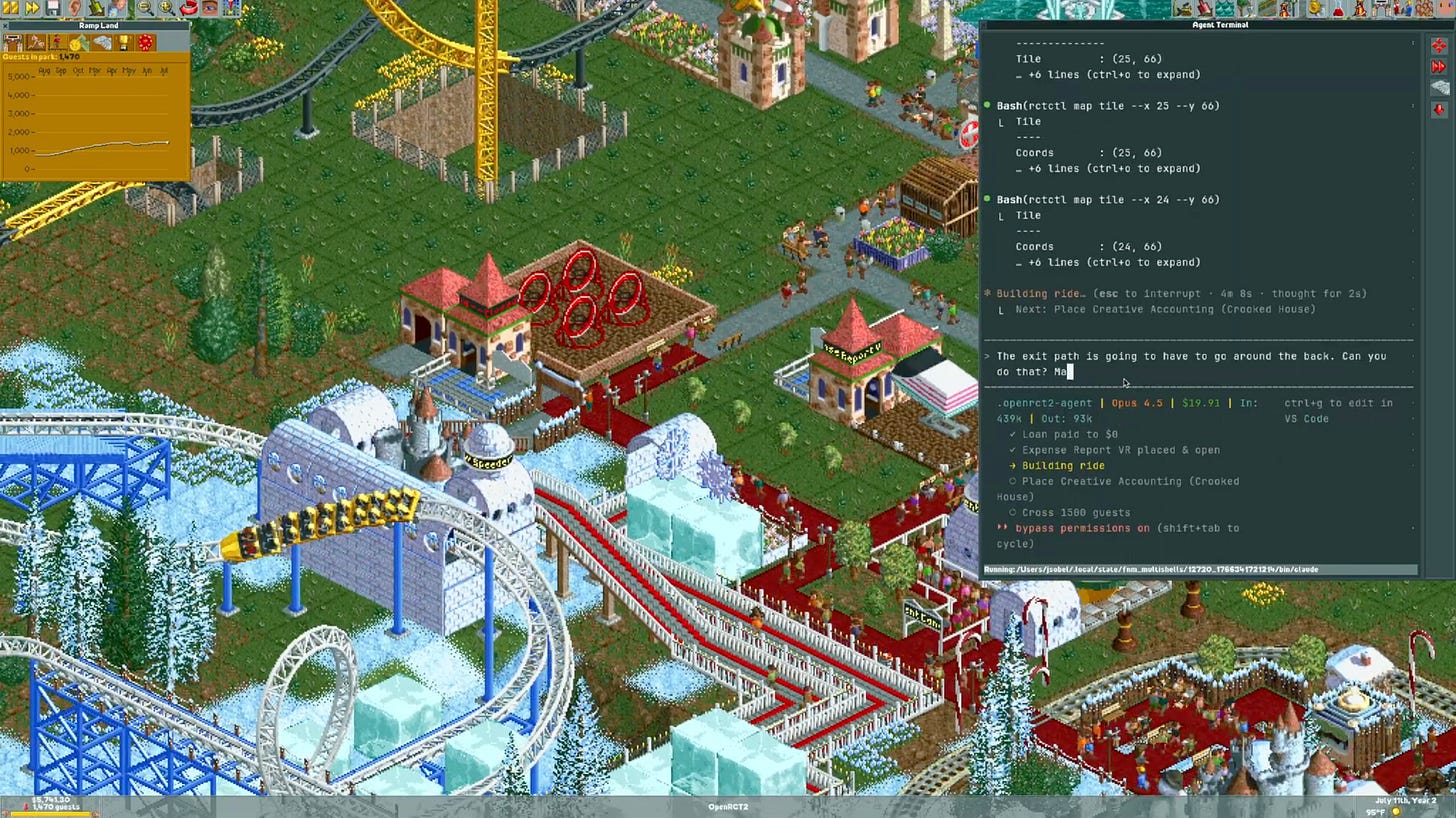In a terminal window in the corner of the screen, Claude Code springs to life. It scans 100 data points you haven’t had time to read: park financials, ride breakdowns, guest complaints about bathroom lines. Within seconds, it compiles a task list: build more Drink Stalls near high-traffic areas, hire mechanics before the coasters start failing, and raise the park entrance fee while satisfaction is high.
